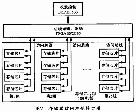 每塊存儲板的訪問控制接口均可由兩片F(xiàn)PGA實現(xiàn)。 由于板上有100片存儲芯片K9WBG08U1M,而輸入/輸出總線只有一套,所以,對芯片的訪問需要通過總線驅(qū)動和譯碼邏輯來實現(xiàn)。該邏輯可由ALTERA公司的Cyclong系列FPGA實現(xiàn),具體型號為EP2C35F67218,它同時可通過EBIU總線與DSP進行數(shù)據(jù)交換。存儲芯片寫入或讀出的數(shù)據(jù)需通過EP2C35。由于板上有100片存儲芯片都連接到EP2C35的一套I/O引腳上,故會導致負載過大而無法工作,所以,可將存儲芯片4個一組,共用一套EP2C35的I/O引腳驅(qū)動,以保證足夠的驅(qū)動能力。來自總線的地址信號輸入到地址譯碼器,用于選擇存儲芯片。輸入為7位地址線,輸出存儲芯片選擇信號csl~csl00其具體接口連接如圖2所示。