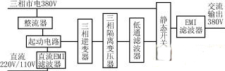整流器將三相交流市電轉(zhuǎn)換為直流電壓,起動(dòng)電路對直流上電過程進(jìn)行限流,防止起動(dòng)過程的大電流沖擊損壞器件;三相逆變器把直流輸入變換為穩(wěn)壓、穩(wěn)頻的三相正弦交流輸出;三相逆變器的輸出經(jīng)三相隔離變壓器升壓,并通過LC低通濾波器進(jìn)行平滑濾波,濾除高頻諧波,然后經(jīng)靜態(tài)開關(guān)接到輸出。三相隔離變壓器有兩個(gè)作用:一是升壓,將三相逆變器輸出的相電壓由110V變換為220V。二是隔離,將逆變器與負(fù)載隔離,這可以對負(fù)載變化起到緩沖作用,也使負(fù)載上無直流電流分量;靜態(tài)開關(guān)用以實(shí)現(xiàn)市電旁路輸出和逆變器輸出之間的切換;輸入輸出端的EMI濾波器用于抑制電磁干擾信號(hào),具雙向隔離作用。