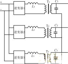 對于三相輸出的逆變器,三相負(fù)載的平衡是一個(gè)必須考慮的重要問題,目前性能較好的大中型UPS都要求具備三相100%不平衡的功能[2]。為了適應(yīng)三相負(fù)載不平衡的需要,三相逆變器最好采用三個(gè)單相橋分別變換,然后再把輸出按120°的相位差組合起來的方式,如圖3所示,每相各有一個(gè)單相橋式逆變器(圖3中的逆變器1~3),每個(gè)單相橋式逆變器需用四個(gè)開關(guān)管。因此總共需要12個(gè)開關(guān)器件,結(jié)構(gòu)較復(fù)雜。帶來的好處是:三個(gè)單相逆變器獨(dú)立工作,其輸出互不影響,實(shí)際上三個(gè)單相逆變器并聯(lián),只是相位不同。這樣可以允許三相負(fù)載100%不平衡,三相嚴(yán)重不平衡也不會(huì)對任一逆變器輸入產(chǎn)生影響。
