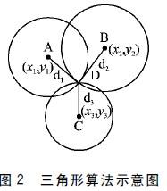 三邊定位法:分別以已知位置的3個(gè)AP為圓心,以各個(gè)到待測(cè)標(biāo)簽的距離最近參考標(biāo)簽的距離為半徑作圓。所得的3個(gè)圓的交點(diǎn)為D.三角形算法示意圖如圖2所示。