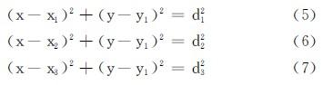 設(shè)位置節(jié)點(diǎn)D(x,y),已知A、B、C三點(diǎn)的坐標(biāo)為(x1,y1),(x2,y2),(x3,y3)。它們到D的距離分別是d1、d2、d3.則D的位置可以通過(guò)下列方程中的任意兩個(gè)進(jìn)行求解。