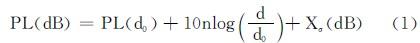 式中:n為路徑損耗指數(shù),與周?chē)沫h(huán)境有關(guān);Xσ是標(biāo)準(zhǔn)差為σ的正態(tài)隨機(jī)變量;d0是參考距離,在室內(nèi)環(huán)境中通常取1 m;PL(d0)為參考位置的信號(hào)強(qiáng)度。