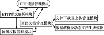 系統(tǒng)運行時,由HTTP連接管理模塊負(fù)責(zé)對網(wǎng)絡(luò)端口進(jìn)行監(jiān)聽,當(dāng)監(jiān)聽到有連接請求到達(dá)后,即進(jìn)入HTTP報文解析模塊進(jìn)行處理,如果解析錯誤,則直接返回HTTP連接管理模塊,發(fā)出相應(yīng)的響應(yīng)報文并關(guān)閉該連接;否則,則根據(jù)對報文解析的結(jié)果,提取出本次要訪問的URL,并將其交給訪問權(quán)限管理模塊,以查看該客戶端是否具有足夠的權(quán)限;然后再轉(zhuǎn)由頁面文檔管理模塊進(jìn)行處理,根據(jù)對報文的初步解析以及對訪問權(quán)限的判斷,由頁面文檔管理模塊來決定是否調(diào)用CGI,以實現(xiàn)文件的下載上傳及響應(yīng)文檔的生成,從而將正確的響應(yīng)報文及頁面文檔轉(zhuǎn)交給HTTP連接管理模塊進(jìn)行網(wǎng)絡(luò)數(shù)據(jù)的應(yīng)答回送。