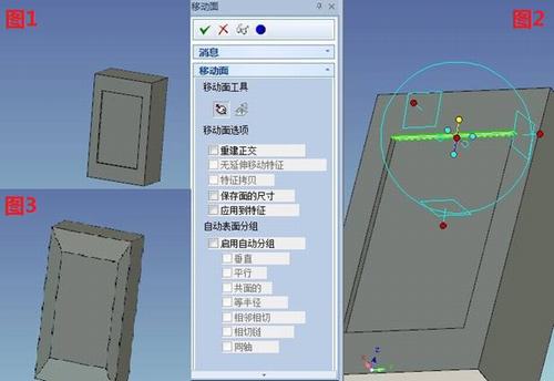 第一、在實體設計右側(cè)的設計元素庫中拖拽入長方體編輯包圍盒的尺寸為200、120、70。再從右側(cè)的設計元素庫中拖入孔內(nèi)長方體放到長方體表面的中心修改尺寸為140、85、4。選中如圖2所示的面,并按鍵盤F10或者鼠標左鍵點擊三維球圖標的快捷鍵,空格鍵三維球與面脫離關(guān)聯(lián)并用點定位的方式移動到靠里邊的邊的中點,再拾取三維球的定向操作柄指向大的長方體的邊的中點。最后四個面分別用此操作形成如圖1、2、3所示。