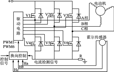 下面以一個三相繞組的無刷電機為例,簡要介紹其工作原理。圖2為三相全橋式驅(qū)動電路原理圖,對其采用二相通電的方式驅(qū)動,即有兩個繞阻同時通電。圖中包含6個晶體管、二極管組成的三相逆變電路,Ha、Hb、Hc為霍爾元件反饋的轉(zhuǎn)子位置信號??刂齐娐窌鶕?jù)位置信號決定6路PWM信號的通斷,進而使功率管導(dǎo)通或關(guān)斷,使繞阻按一定順序?qū)ǎ?qū)動電機連續(xù)旋轉(zhuǎn)。
