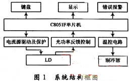 本系統(tǒng)原理如圖1所示,主要實現(xiàn)電流源驅動及保護、光功率反饋控制、恒溫控制、錯誤報警及鍵盤顯示等功能,整個系統(tǒng)由單片機控制。本系統(tǒng)中選用了C8051F單片機。C8051F單片機是完全集成的混合信號系統(tǒng)級芯片(SOC),他在一個芯片內集成了構成一個單片機數(shù)據(jù)采集或控制系統(tǒng)所需要的幾乎所有模擬和數(shù)字外設及其他功能部件,如本系統(tǒng)中用到的ADC和DAC。這些外設部件的高度集成為設計小體積、低功耗、高可靠性、高性能的單片機應用系統(tǒng)提供了方便,也大大降低了系統(tǒng)的成本。光功率及溫度采樣模擬信號經(jīng)放大后由單片機內部A/D轉換為數(shù)字信號,進行運算處理,反饋控制信號經(jīng)內部D/A轉換后再分別送往激光器電流源電路和溫控電路,形成光功率和溫度的閉環(huán)控制。光功率設定從鍵盤輸入,并由LED數(shù)碼管顯示激光功率和電流等數(shù)據(jù)。