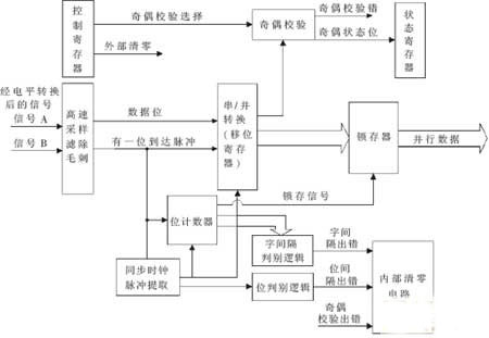 接收部分的主要作用是通過串/并轉(zhuǎn)換將串行數(shù)據(jù)轉(zhuǎn)換為32位并行數(shù)據(jù),并對收到的數(shù)據(jù)自動實行差錯控制。對于字間隔、位間隔出錯等錯誤能進行自動檢測,若無錯誤,則將數(shù)據(jù)分兩次送至DSP的16位數(shù)據(jù)總線上,以供讀取。接收模塊結(jié)構(gòu)框圖如圖3所示。