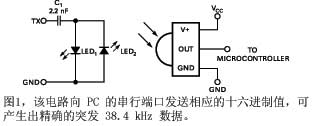 圖1中的電路與串行端口輸出阻抗和電容一起構(gòu)成了一個高通濾波器。正脈沖驅(qū)動一只紅外LED;負(fù)脈沖驅(qū)動另一只。兩只都應(yīng)指向接收器。PC端口一般提供5mA~20mA的最大電流,以及±15V電壓,因此輸出電阻在數(shù)千歐姆范圍內(nèi)。一般不需要限流電阻。多數(shù)情況下,電容容量為1nF~10nF就可以了。接收器有寬容度。如果是非PC端口,則需要調(diào)整電容值,例如微控制器,因為它的阻抗較低。在實際應(yīng)用中,如果LED對準(zhǔn)接收器,用低至5mA的LED峰值電流就可以實現(xiàn)2米~4米的傳輸距離??商峁C的實例程序。