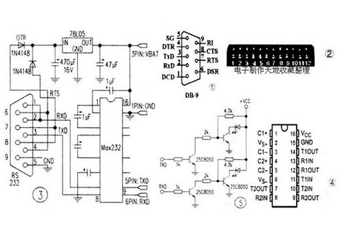 元件選擇: 本電路的核心為MAX232集成塊,常見的有兩種封裝,一種為雙列直插式,體積稍大,焊接方便;另一種為貼片式,體積較小。此外,如找不到MAX232,也可用MAX232A、 HIN232、MAX220、MAX3232、IL32等RS232收發(fā)器集成塊代替,管腳定義和MAX232相同,前兩種集成塊速度較快。78L05外表和普通三極管一樣,購買時要注意問清管腳定義。如發(fā)現(xiàn)發(fā)熱嚴重可用7805代替,或者用1V穩(wěn)壓管加接限流電阻代替。電容的焊接要注意分清正負極。濾波電容兩端并上一只0.1uF的CBB電容效果更好。4個參數(shù)電容最好選用鉭電容等優(yōu)質(zhì)電容,根據(jù)集成塊不同可選擇luF或O.1uF的容量。比較難找的是手機插頭,不過可以從同類型接口的廢舊充電器上取得,但要注意所有金屬針腳都要齊全的。電纜用帶屏蔽的6芯電纜。 以上材料可以在電子元器件商店或電腦網(wǎng)絡(luò)耗材店購得,10元左右就能買齊。