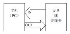 1. 標(biāo)記包。USB 中所有事務(wù)都是由主機(jī)(PC)來完成的。IN 表示數(shù)據(jù)被讀入PC,OUT 表示數(shù)據(jù)由主機(jī)送出至設(shè)備,如圖6 所示。