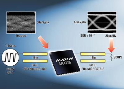 Maxim推出用于銅纜互連的四通道、1Gbps至8.5Gbps信號調(diào)理器MAX3987。器件每個通道的輸入和輸出端可均衡30英寸的FR4信號傳輸以及10米的24AWG電纜,支持高達8.5Gbps的數(shù)據(jù)速率。該款通用器件可用作接收均衡器、預加重驅(qū)動器或轉(zhuǎn)接驅(qū)動器,能夠放置在信號鏈路的開始、中間或末端。此外,MAX3987還具有一個I2C接口,用于配置每個通道的預加重電平、輸出擺幅和輸出極性,也可以使用外部引腳對這些特性進行整體配置。MAX3987作為一個多協(xié)議方案便于IP復用,這種方式允許用戶在多種應用中使用同一個設計。器件非常適合6.25Gbps XAUI、8.5Gbps光纖通道、6.0Gbps SAS/SATA及InfiniBand DDR應用。