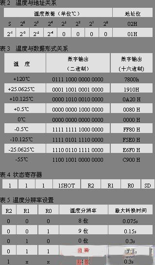 傳感器DS1722將溫度轉(zhuǎn)換成數(shù)字量后以二進(jìn)制的補(bǔ)碼格式存儲(chǔ)于溫度寄存器中,通過SPI或者三線接口,溫度寄存器中地址01H和02H中的數(shù)據(jù)可以被讀出。輸出數(shù)據(jù)的地址如表2所示,輸出數(shù)據(jù)的二進(jìn)制形式與十六進(jìn)制形式的精確關(guān)系如表3所示。在表3中,假定DS1722 配置為12位分辨率。數(shù)據(jù)通過數(shù)字接口連續(xù)傳送,MSB(最高有效位)首先通過SPI傳輸,LSB(最低有效位)首先通過三線傳輸。
