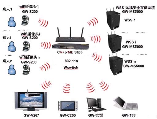 系統(tǒng)的最大特點是采用無線攝像頭(構(gòu)成監(jiān)控站點)、無線監(jiān)控屏(WLCD)和無線安全數(shù)據(jù)存儲陣列硬盤組WSS(監(jiān)控數(shù)據(jù)中心)、無線集線器(WSwitch)等構(gòu)成監(jiān)控系統(tǒng)的主體。其優(yōu)點在于部署方便,且可以動態(tài)配置,在任何需要采集視頻的地方都可以架設(shè),甚至在醫(yī)院的任何一個住院科室、急診室進行單獨部署。通過在百米范圍內(nèi)部署的無線路由器,無線攝像頭可以把視頻圖像實時的傳輸?shù)骄W(wǎng)絡(luò)上。