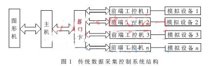 前端設(shè)備種類繁多,因此實(shí)際中需有針對性地進(jìn)行設(shè)計(jì),以實(shí)現(xiàn)工控機(jī)對前端設(shè)備的控制。此外,工控機(jī)與主機(jī)之間還必須通過專用接口進(jìn)行通信,如圖1所示。其結(jié)構(gòu)復(fù)雜,不利于設(shè)計(jì)和調(diào)試,同時(shí)降低了模擬仿真系統(tǒng)的實(shí)時(shí)性和效率。