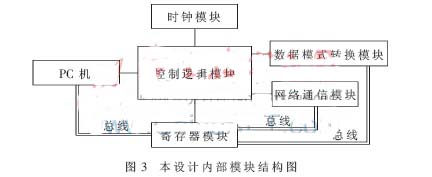 基于前述數(shù)據(jù)采集控制過程,本IP核分發(fā)送數(shù)據(jù)和采集數(shù)據(jù)兩種處理機(jī)制進(jìn)行設(shè)計(jì)。相應(yīng)地,將本IP核內(nèi)部劃分為IP核控制邏輯模塊、數(shù)據(jù)模式轉(zhuǎn)換模塊、網(wǎng)絡(luò)通信模塊、寄存器模塊、總線模塊以及時(shí)鐘模塊六部分。其相互關(guān)系如圖3所示。