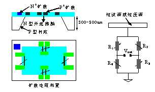 利用壓阻效應(yīng)原理,采用集成工藝技術(shù)經(jīng)過摻雜、擴(kuò)散,沿單晶硅片上的特定晶向,制成應(yīng)變電阻,構(gòu)成惠斯通電橋,利用硅材料的彈性力學(xué)特性,在同一硅材料上進(jìn)行各向異性微加工,就制成了一個(gè)集力敏與力電轉(zhuǎn)換檢測(cè)于一體的擴(kuò)散硅傳感器,如圖1所示。