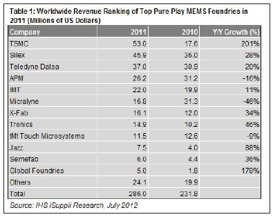 在12家提供MEMS制造業(yè)務(wù)的純代工廠(chǎng)商中,臺(tái)積電名列前茅。除了臺(tái)積電以外,去年MEMS營(yíng)業(yè)收入增長(zhǎng)的其它代工廠(chǎng)商包括Silex Microsystems、Teledyne Dalsa、Innovative Micro Technology、X-Fab, Tronics、Jazz Semiconductor、Semefab和GlobalFoundries。營(yíng)業(yè)收入下滑的廠(chǎng)商是Asia-Paci?c Microsystems、Micralyne和tMt Touch Microsystems,如表1所示。