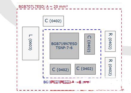 圖1: BGB719N7ESD相較于前幾代的產(chǎn)品(BGB707L7)所需外圍器件更少,從而更節(jié)省PCB板的空間