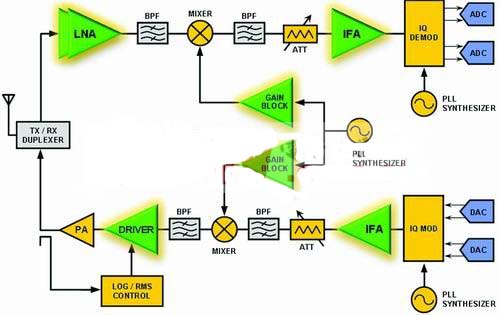 在通信基礎(chǔ)設(shè)施設(shè)備、雷達、RFID閱讀器、測控、消費電子、醫(yī)療設(shè)備的RF信號鏈(圖1)中,放大器(低噪聲放大器LNA,中頻放大器IFA,驅(qū)動放大器及增益模塊)是重要的器件。ADI公司最新推出覆蓋全部射頻信號鏈的12個放大器。這些放大器與功率檢測器、調(diào)制器、解調(diào)器、合成器產(chǎn)品相結(jié)合實現(xiàn)完整的信號鏈方案。ADI公司新的四個高性能射頻放大器家族產(chǎn)品包括LNA(低噪聲放大器)、IFA(中頻放大器)、驅(qū)動放大器和射頻增益模塊。