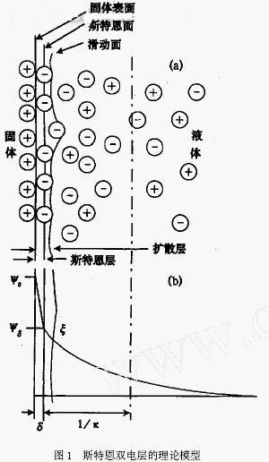任何固體與任何液體相互接觸時,都會使固體表面呈現出帶電現象。究其原因主要有以下幾個方面: (1) 固體表面對離子的吸附;(2) 離子晶體的溶解;(3) 固體表面的電離;(4) 固體具有n 型(空穴型)或p 型(電子過剩型) 缺陷;(5) 兩相對電子的親合力不同。不管是由哪種原因引起的,當固體表面帶電以后,它必然要吸引等量的反極性電荷在其周圍。這樣在緊靠帶電固體表面處就形成一層特殊的表面層———雙電層。雙電層的經典理論有以下三種:德拜—尤格爾理論;古依—查普曼理論;斯特恩理論。其中斯特恩理論對實驗結果的解釋至今絕大部分仍然是正確的。斯特恩雙電層的理論模型如圖1 所示。從圖中可以看出,雙電層由一個稱為斯特恩平面的平面(實際上是一個假想平面) 將它分成二部分:內層為斯特恩層,外層為擴散層,在擴散層中,反電荷離子富集。