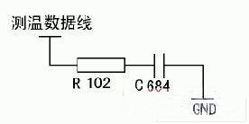 測溫電路采用的是單總線芯片DS18B20,該芯片具有測溫精度高,連接線路簡單等優(yōu)點,其測溫范圍為-55℃到+125℃。適合于采暖系統(tǒng)測溫,在實際應(yīng)用中當(dāng)溫度在 60℃以下時可正常工作,隨著溫度的升高,當(dāng)溫度大于 60℃以上時,測溫數(shù)據(jù)開始跳動,且溫度越高跳動越劇烈,甚至無法觀測。電源加了濾波退偶電路效果不明顯,在數(shù)據(jù)線上并接小電容進行高頻旁路時,電容小不起作用,電容大了則數(shù)字信號消失。最后經(jīng)試驗在數(shù)字電路上加如圖 1所示標(biāo)稱值的 RC阻容濾波電路達到了預(yù)期效果。