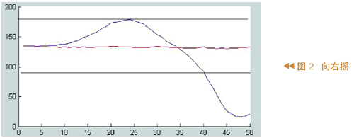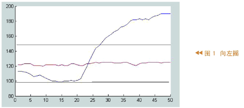 從圖1和圖2中可以看出,兩條黑線之間的數(shù)據(jù)很難斷定是哪個(gè)動(dòng)作產(chǎn)生的,因?yàn)閮蓚€(gè)動(dòng)作都可能產(chǎn)生這樣的值。所以,利用黑線之外的數(shù)據(jù)來(lái)判定是向右還是向左搖。因?yàn)閷?duì)于這兩個(gè)動(dòng)作,黑線之外的數(shù)據(jù)有明顯的差異,數(shù)據(jù)相差很多。對(duì)于圖1這些數(shù)據(jù)大于150,圖2中這些數(shù)據(jù)小于90。因此這些數(shù)據(jù)至少相差60,可以很容易地將向左、向右的兩個(gè)動(dòng)作區(qū)分開(kāi)。