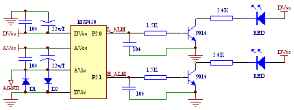 本系統(tǒng)的基本方案是這樣的:ADC12模塊的通道10對芯片的溫度進行測量,當(dāng)測量溫度高于或者低于預(yù)設(shè)告警值時,便通過I/O端口的輸出來驅(qū)動LED,顯示告警狀態(tài)。芯片在整個過程中處于低功耗模式。本系統(tǒng)的原理比較簡單,圖1給出其簡單的原理圖。