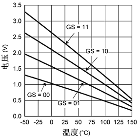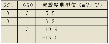 LM94022根據(jù)GS0、GS1被施加的不同電平有4種靈敏度供用戶選擇,如表2所示。用戶可根據(jù)測(cè)溫的范圍及接口電路的工作電壓的條件來合理選擇。靈敏度由GS0及GS1的電平確定:高電平要求大于(VDD-0.5V);低電平要求小于0.5V。