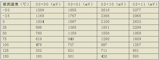 從圖2可看出,其線性度極好,這是線性化后的特性。按表3的數(shù)據(jù)計(jì)算出的靈敏度值與表2給出的典型靈敏度有一些差值。例如,在GS=00時(shí),-25℃時(shí)的輸出電壓為1168mV,-50℃時(shí)的輸出電壓為1299mV,則其平均靈敏度為-5.24mV/℃;50℃時(shí)的輸出電壓為760mV,75℃時(shí)的輸出電壓為619mV,則其平均靈敏度為5.64mV/℃。表2中GS=00時(shí),靈敏度為-5.5mV/℃。