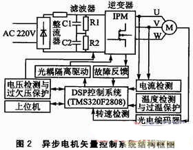 本系統(tǒng)采用主回路為電壓型的“交-直-交”變頻結(jié)構(gòu),主要由整流電路、濾波電路以及逆變電路組成。為了使主回路結(jié)構(gòu)簡單并且便于器件的更換和維修,本設(shè)計采用了模塊化的結(jié)構(gòu)設(shè)計方案。圖2為基于TMS320F2808的異步電機矢量控制系統(tǒng)的結(jié)構(gòu)框圖。