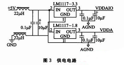 圖3為供電電路。為了提高控制系統(tǒng)的穩(wěn)定性和延長器件的使用壽命,本設(shè)計采用高性能穩(wěn)壓芯片、低壓差電壓調(diào)節(jié)器LM1117,為TMS 320F2808提供可靠的供電電源。分別選用3.3 V和1.8 V的固定電壓輸出芯片為DSP供電,其輸出電流可達(dá)800 mA,輸出電壓的精度在±1%以內(nèi),并具有電流限制和熱保護(hù)功能。