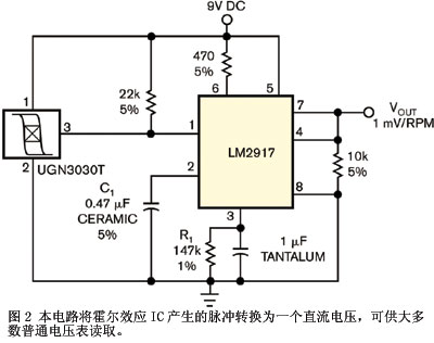 圖2中的電路將來自霍爾效應(yīng)的脈沖轉(zhuǎn)換為一個直流電壓,多數(shù)普通電壓計就可以讀取?;魻栃?yīng)IC提供的是集電極開路輸出。你只需要一只上拉電阻。傳感器對產(chǎn)生的系列脈沖作轉(zhuǎn)換,用美國國家半導(dǎo)體公司的LM2917頻率-電壓轉(zhuǎn)換器轉(zhuǎn)成電壓。選擇C1和R1,根據(jù)本器件電荷泵部分會遇到的頻率范圍調(diào)整輸出電壓。對一個四沖程的單缸引擎,到5000 r/min就足夠了。