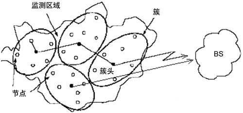 本文中,我們重點(diǎn)評(píng)價(jià)更具有能量有效性的分簇路由算法,它將無(wú)線(xiàn)傳感器網(wǎng)絡(luò)分成若干簇,每個(gè)簇選舉出一個(gè)簇頭,簇頭作為本地基站將簇內(nèi)節(jié)點(diǎn)傳給它的數(shù)據(jù)進(jìn)行數(shù)據(jù)融合[5]后再傳給基站(圖2),因而大大降低了節(jié)點(diǎn)消耗的能量,延長(zhǎng)了網(wǎng)絡(luò)壽命。