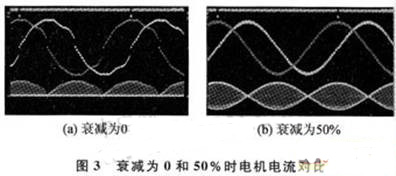 步進電機的細分控制,從本質(zhì)上講是通過對步進電機勵磁繞組中電流的控制,使步進電機內(nèi)部的合成磁場為均勻的圓形旋轉(zhuǎn)磁場,從而實現(xiàn)步進電機步距角的細分。一般情況下,合成磁場矢量的幅值決定了步進電機旋轉(zhuǎn)力矩的大小,相鄰兩合成磁場矢量之間的夾角大小決定了步距角的大小。DCY2、DCY1外接撥碼開關設置電流衰減模式(0、25%、50%、 100%),用于滿足不同的步進電機需要。由于電機本身狀況、供電電源狀況及脈沖頻率等其他因素的影響,步進電機可能會產(chǎn)生高頻噪聲,通過電流衰減模式的設置可減小甚至消除這種噪聲。圖3顯示了衰減模式為0和50%時線圈電流的變化,可看出波形具有明顯的改善。