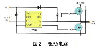 電機的PWM驅動電路如圖2所示。本電路中,無刷直流電機采用全橋驅動,這樣可以使用電機工作于四象限(正向驅動、制動及反向驅動、制動)。驅動一個無刷直流電機需要6路PWM信號,而MotionChip的每個事件管理模塊(EV)中3個帶可編程死區(qū)控制的比較單元可以產(chǎn)生獨立的3對共6路PWM 信號。所以在電路中,直接選用事件管理模塊B(EVB)中的比較單元來產(chǎn)生6路所需要的PWM信號,其輸出引腳為PWM7~PWM12,其中 PWM7~PWM9輸出設為驅動MOSFET功率管橋路的上半橋,PWM10~PWM12輸出驅動下半橋。DSP輸出的這兩種3路PWM信號經(jīng)過 IR2102前置放大后分別驅動MOSFET功率管橋路的上半橋(Q1,Q3,Q5)和下半橋(Q2,Q4,Q6)進行電機的驅動。