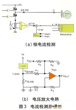 電機電流檢測電路可提供重要的反饋信息,將該信息與來自主控DSP的控制信號相結合,可以控制MOSFET或IGBT的柵極驅動芯片并最終調整電機速度。如果要實現(xiàn)過流保護,還必需進行電流監(jiān)控,不過對于低端應用而言,傳統(tǒng)的過流保護卻顯得過于昂貴。電流采樣的方案是在逆變橋的下橋臂串一 0.027Ω采樣電阻如圖3(a),采樣電流范圍為0~6.22A,采樣后的電壓放大倍數(shù)為14.63倍,放大電路如圖3(b),并經(jīng)2.5V電壓抬升輸入DSP,所以輸入DSP的電流模擬電壓量為: