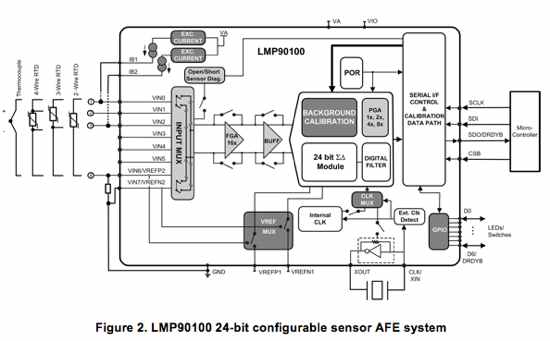 總之,溫度傳感器需要偏置(電壓或者電流)。使用熱電偶時(shí),需要冷結(jié)溫補(bǔ)償。TI擁有一整套解決方案,可以滿足這些要求。LMP90100是一種24位傳感器AFE系統(tǒng),擁有四個(gè)差動(dòng)輸入或者七個(gè)單端輸入,兩個(gè)匹配可編程電流源,以及連續(xù)本底校準(zhǔn)(圖2)。LMP90100是一款集成可配置芯片,是克服各種溫度傳感器相關(guān)設(shè)計(jì)挑戰(zhàn)的理想選擇。