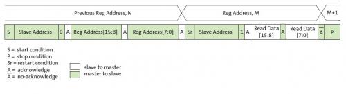 If the request was a WRITE, the master then transfers the 16-bit register address to which a WRITE will take place. This transfer takes place as two 8-bit sequences and the slave sends an acknowledge bit after each sequence to indicate that the byte has been received. The master will then transfer the 16-bit data, as two 8-bit sequences and the slave sends an acknowledge bit after each sequence to indicate that the byte has been received. The master stops writing by generating a (re)start or stop condition. If the request was a READ, the master sends the 8-bit write slave address/data direction byte and 16-bit register address, just as in the write request. The master then generates a (re)start condition and the 8-bit read slave address/data direction byte, and clocks out the register data, 8 bits at a time. The master generates an acknowledge bit after each 8- bit transfer. The data transfer is stopped when the master sends a no-acknowledge bit.