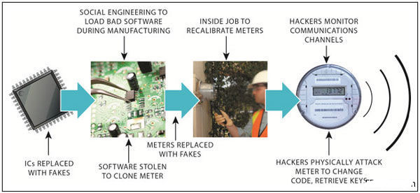 即使掛網(wǎng)的電表都具備一定的保護(hù)措施,可在一定程度上防止篡改。我們?nèi)匀荒軌虬l(fā)現(xiàn)一些容易遭受攻擊的環(huán)節(jié)——生產(chǎn)環(huán)節(jié),所謂的“社交工程”為攻擊者侵入IP和生產(chǎn)流程提供了機(jī)會?;ㄙM(fèi)數(shù)千美金,攻擊者就有可能獲取程序,通過逆向工程修改后,將“新程序”植入產(chǎn)品。另外,攻擊者也可以將你的程序出售給競爭對手,造成巨大損失。