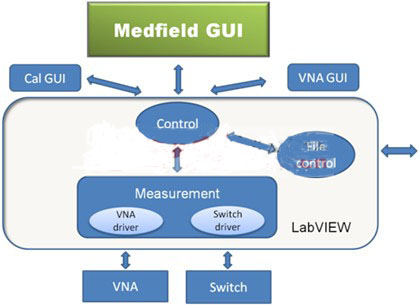 我們用LabVIEW和PXI平臺建立了一套系統(tǒng),將一個基于PC的控制器、一個NI PXI-2547、一個NI PXI-2548射頻儀器和一個NI PXIe-5630網(wǎng)絡(luò)分析儀整合為一個獨立單元。該測量裝置戴在病人頭上,并且使用十二根天線與系統(tǒng)相連。
