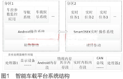 本文綜合考慮了成本、性能需求以及系統(tǒng)實現(xiàn)的復(fù)雜程度,提出了一種基于分區(qū)機制的多操作系統(tǒng)并行處理方法。在多核處理器的硬件平臺上,基于嵌入式虛擬化技術(shù)中的分區(qū)機制將軟件平臺隔離為不同計算區(qū)域。在每個物理的處理器上部署一個嵌入式操作系統(tǒng),其結(jié)構(gòu)圖如圖1所示。其中,Android OS負責處理非實時的人機交互應(yīng)用,SmartOSEK OS[11]負責處理實時控制應(yīng)用。本文在系統(tǒng)設(shè)計上采用有效的分區(qū)機制使二者相互隔離。