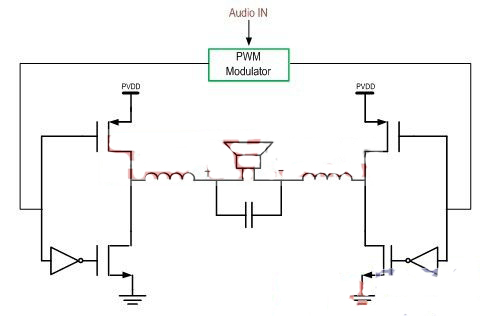 1 固定開關(guān)損耗使靜態(tài)電流更高,使小功率輸出的功效更低。D類放大器本質(zhì)上是開關(guān)電路。在其 基本架構(gòu)下,它們基于對音頻信號編碼的模式在ON和OFF之間切換。將開關(guān)輸出通過低通濾波器傳輸至負載(揚聲器),從而恢復被放大的音頻信號。參見上面的圖3。