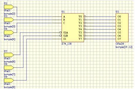 圖1畫好的PLD原理圖這是一個(gè)3-8譯碼器的PLD文件。輸入信號為目標(biāo)元件的2、3、4三個(gè)腳,輸出信號為目標(biāo)元件的12-19腳,6-8腳為使能控制端。