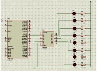 將單片機(jī)的程序加入AT89C52后,在Proteus中點(diǎn)擊Play鍵觀看電路仿真結(jié)果:當(dāng)輸入端的I1、I2、I3值按程序設(shè)定按真值表中的000—111依附改變時(shí),輸出端對應(yīng)LED燈按真值表中的對應(yīng)關(guān)系由IO0至IO7依次點(diǎn)亮,如下圖。說明PLD器件16V8設(shè)計(jì)的三八譯碼器譯碼正確。