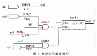 由于要對(duì)傳感器信號(hào)進(jìn)行數(shù)字濾波,CPLD要引入時(shí)鐘信號(hào)。因而我們對(duì)CPLD定義一輸入端clki,作為數(shù)字濾波器的計(jì)數(shù)脈沖輸入端。clki由單片機(jī)定時(shí)器1定時(shí)產(chǎn)生500Hz脈沖。以一路為例,泵沖信號(hào)濾波部分如圖1所示。