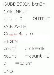 oo0為經(jīng)電平轉(zhuǎn)換后接近開(kāi)關(guān)輸出的信號(hào)。當(dāng)oo0為低電平時(shí),說(shuō)明泵1未動(dòng)作,封鎖三端與門(mén),時(shí)鐘信號(hào)clki無(wú)法通過(guò),計(jì)數(shù)器bcn3n不計(jì)數(shù)。同理,當(dāng)aa4為高電平時(shí),亦封鎖三端與門(mén)(至于aa4如何變化及作用下文有介紹)。故當(dāng)oo0為高、aa4為低時(shí),clki接通計(jì)數(shù)器CLK端。當(dāng)oo0和clr端任意一個(gè)為低時(shí),計(jì)數(shù)器清零。計(jì)數(shù)器bcn3n由MAX+PLUSII的文本編輯器編輯,其文本如下: