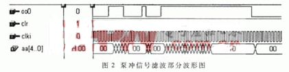 由波形可知,oo0為高,計(jì)數(shù)器開(kāi)始計(jì)數(shù)。對(duì)于小的脈沖,計(jì)數(shù)器的最高位即aa4為低,認(rèn)為是干擾信號(hào);只有當(dāng)aa4為1時(shí)才認(rèn)為oo0的脈沖信號(hào)有效,并通過(guò)aa4將時(shí)鐘脈沖阻斷,使計(jì)數(shù)器值不再增加。這樣做是為了防止由于oo0的脈沖不定寬,使aa4的電平不定,后面無(wú)法進(jìn)行處理。還應(yīng)注意的是,把oo0引入了清零信號(hào)。當(dāng)信號(hào)有較多毛刺時(shí),若oo0為低時(shí)不清零則使計(jì)數(shù)器不斷累加,積累到一定程度,使aa4為1,系統(tǒng)將認(rèn)為有一有效脈沖信號(hào),產(chǎn)生誤動(dòng)作。