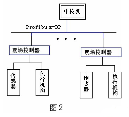 對(duì)于不同的染色品種,對(duì)應(yīng)的溫度工藝曲線也是不同的,若將所有可能用到的溫度曲線存入現(xiàn)場(chǎng)控制器中,則對(duì)現(xiàn)場(chǎng)控制器的內(nèi)存要求很高,因此本系統(tǒng)設(shè)計(jì)通過中控機(jī),將工藝人員設(shè)定的不同的溫度工藝曲線,全部由工作人員在中控機(jī)上輸入后經(jīng)PROFIBUS—DP 現(xiàn)場(chǎng)總線下傳給現(xiàn)場(chǎng)控制器,現(xiàn)場(chǎng)控制器根據(jù)接收的溫度工藝曲線進(jìn)行溫度控制,同時(shí)現(xiàn)場(chǎng)控制器可以隨時(shí)向中控機(jī)申請(qǐng)修改溫度工藝曲線的參數(shù)。在網(wǎng)絡(luò)中斷時(shí),現(xiàn)場(chǎng)控制器可以保存當(dāng)前的溫度工藝曲線,并且具有斷電長(zhǎng)期保存當(dāng)前溫度曲線的功能,同時(shí)可以將現(xiàn)場(chǎng)的溫度等信號(hào)上傳至中控機(jī),形成監(jiān)控界面,如果需要可以通過網(wǎng)卡將中控機(jī)同工廠信息網(wǎng)以及Internet 網(wǎng)相連,實(shí)現(xiàn)底層到高層的信息共享。系統(tǒng)的結(jié)構(gòu)圖如圖2 所示。