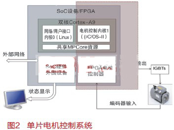 隨著ARM Cortex-A9多處理器和FPGA SoC的推出,可把現(xiàn)有的分立微控制器和數(shù)字邏輯功能集成到一個(gè)多核器件中。這減小了功耗和體積,而主要難點(diǎn)之一是在一個(gè)器件中同時(shí)實(shí)現(xiàn)安全關(guān)鍵和非安全關(guān)鍵軟件單元。圖1顯示了使用三個(gè)分立器件實(shí)現(xiàn)的一個(gè)典型電機(jī)控制系統(tǒng)。系統(tǒng)有一個(gè)非安全網(wǎng)絡(luò)/用戶接口處理器,一個(gè)電機(jī)控制監(jiān)控微控制器和一片用于實(shí)現(xiàn)硬核實(shí)時(shí)電機(jī)控制器的FPGA。圖1中的陰影部分含有設(shè)計(jì)的安全關(guān)鍵單元,需要通過外部權(quán)威機(jī)構(gòu)進(jìn)行安全認(rèn)證。