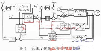 基于上述交流異步電機(jī)的無速度傳感器矢量控制框圖如圖1所示。